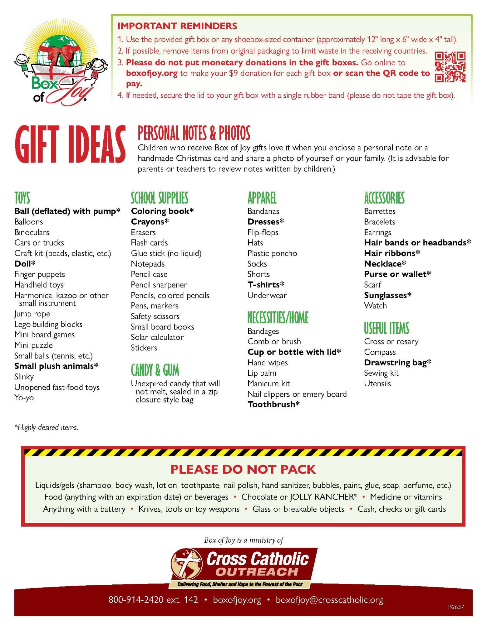 Box of Joy is an annual Christmas shoebox gift ministry by Cross Catholic Outreach. Participants bless children suffering from extreme poverty by filling boxes with toys and other gifts, sharing the joy of Christmas and planting seeds of hope. Our goal is to prepare 200 boxes this year. Please see the list below for the types of items needed. Drop off your donations in the box in the foyer or by the office in the Parish Center. We will have a final boxing event to put everything together on Sunday, Oct. 19 at 6:00 p.m. All are invited.