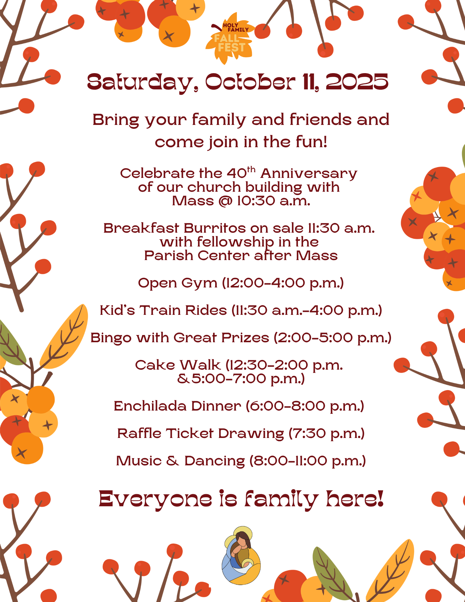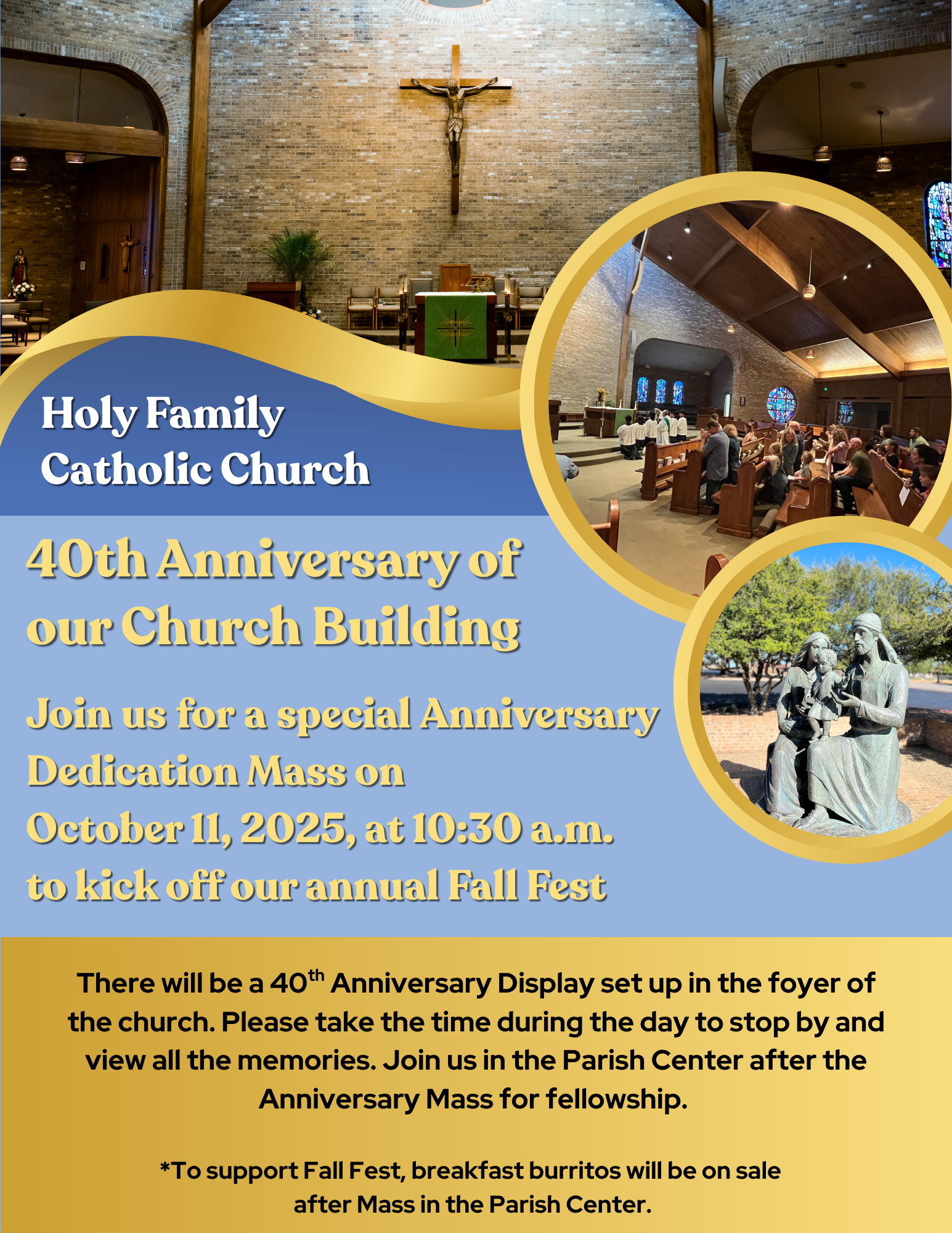 Each year our Holy Family Parish honors married couples celebrating special anniversary years with an evening of entertainment and dinner. If you are celebrating 5, 10, 15, 20, 25, 30, 35, 40, 45, or 50 years of marriage you are invited to this year’s Anniversary Dinner. For those couples who have surpassed 50 years of marriage, you are invited regardless of the number of years. Some would say you earned it. This year’s Anniversary Dinner will be held on November 22, 2025, from 6:30-9:00PM in the Parish Center. If you are celebrating one of these years, please join us. Use the button below to RSVP or contact Amanda in the church office, 325-692-1820, option 4, and let her know you plan on attending. Please let Amanda know how many years you are celebrating in 2025. For our planning purposes please do so by November 10, 2025. We look forward to seeing you there.