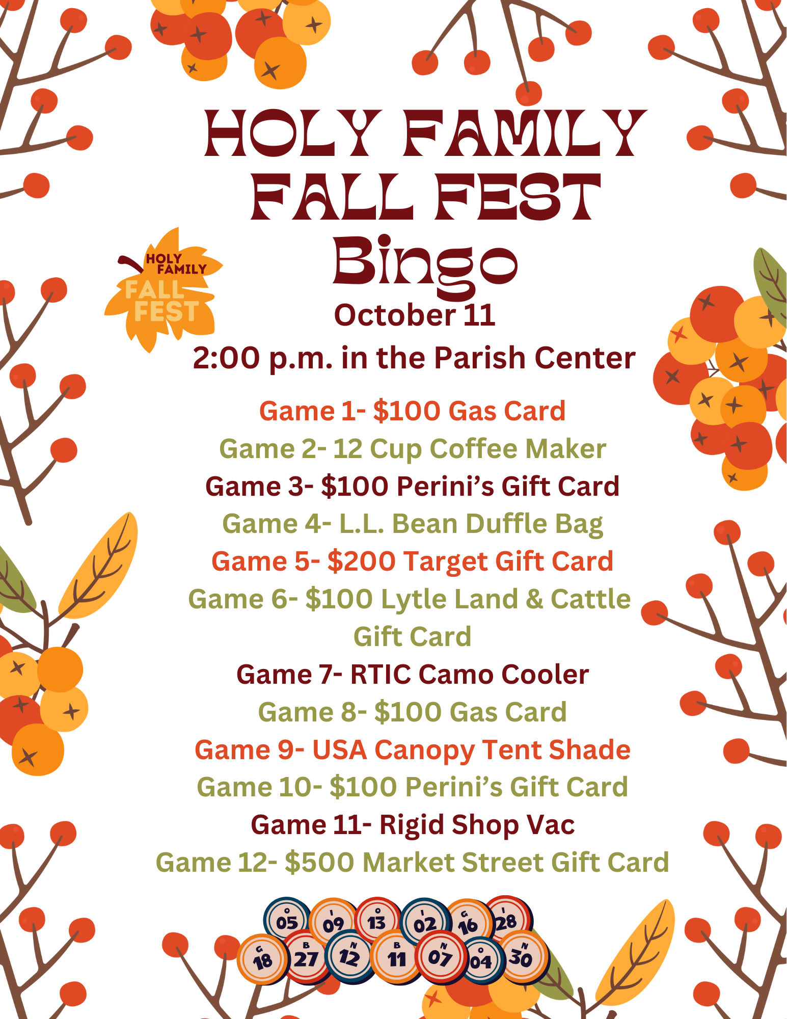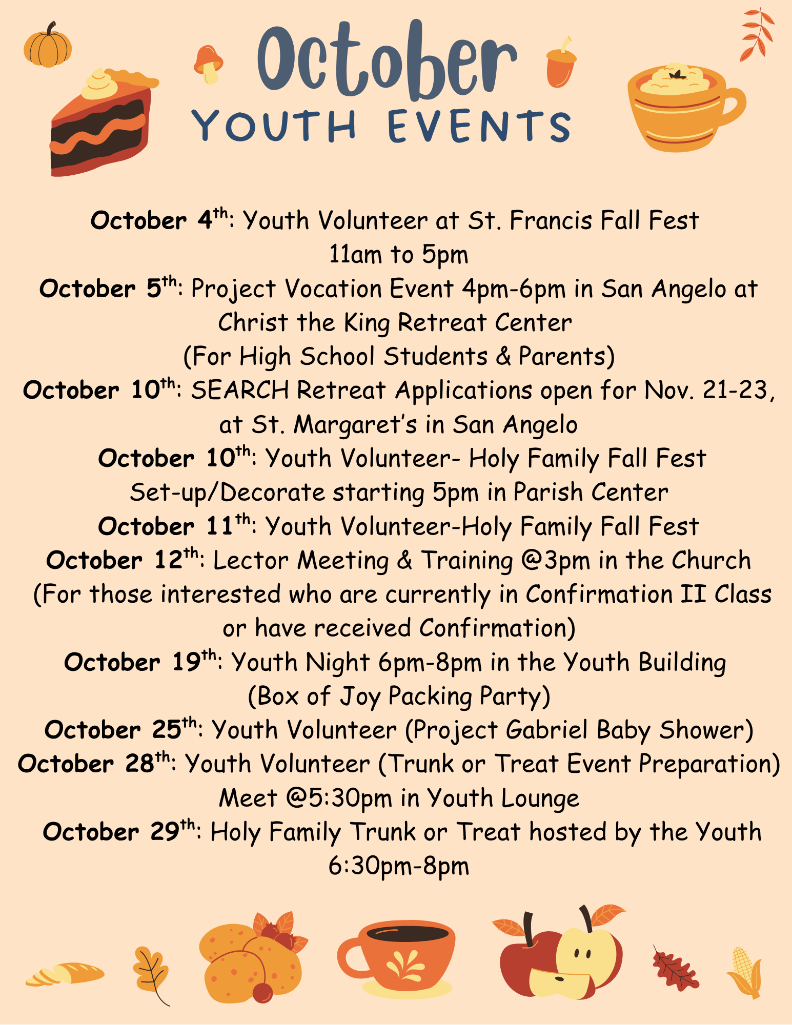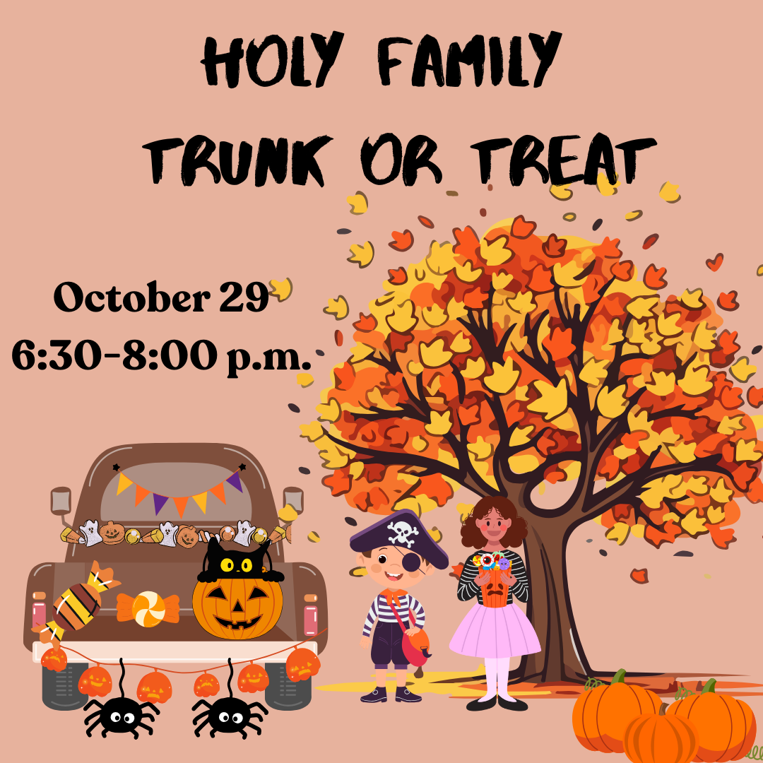 On October 29, we will be hosting our 2nd annual Trunk or Treat in the Holy Family Parking lot. Bring your friends and family for all the fun! We need some groups or families that want to decorate and host a trunk. If you’d like to host a trunk or even just donate candy, please contact Diana Masga at 940-447-1921. This was a huge hit last year and a great family event and outreach to our community.