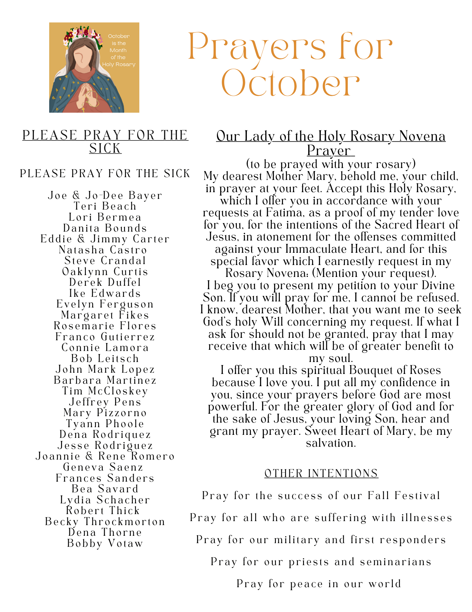 February 2026 - Marian Garden and Rosary Garden Service Project - Be involved in preparing the beds and planting flowers to honor Our Blessed Mother, Mary. Specific times, dates and events to be announced.